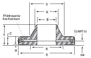 GENERAL NOTE: Dimensions are in inches. NOTES: (1) Other NPT sizes may be furnished if required. (2) Weldneck flanges NPS 3 and smaller are identical to Class 300 flanges except for bolting and may be used for such service. (3) All other dimensions are in accordance with ASME/ANSI B16.5. (4) 0.06 in. height of raised face in NPS 1-3 is included in dimensions C and Y.